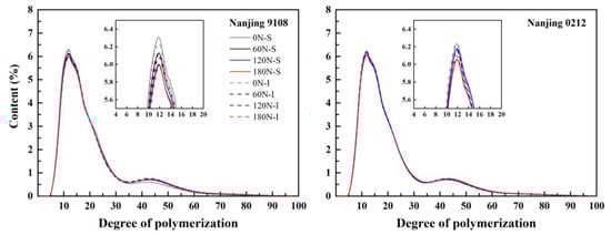 From the analysis of variance, nitrogen and variety had significant effect on A chain, B1 and B2 chain. Position has no significant effect on the B1 chain, B3 chain and average DP (Table S2). The chain lengths of amylopectin in superior and inferior grains of japonica rice under different PNF treatments showed a bimodal distribution, and each treatment reached its peak when the DP was 12 (Figure 2). The chain length distribution of amylopectin was classified into A chain (DP 6–12), B1 chain (DP 13–24), B2 chain (DP 25–36) and B3 chain (DP > 36) according to previous studies [40], where the A and B1 chains were short chains, and the B2 and B3 chains were long chains. The chain length distribution of amylopectin between superior and inferior grains of japonica rice was basically identical for the two varieties studied. Compared with inferior grains, the proportion of B3 chain of superior grains was 1.10–2.48% higher, (A + B1)/(B2 + B3) was 1.01–3.17% lower, and the average chain length was 0.66–1.25% higher under high nitrogen (120 N and 180 N) treatments, which showed few differences between varieties (Table 4). The similarity of chain length distribution and the response to nitrogen application rate for both varieties indicates that genetic background was the main factor regulating the distribution of amylopectin chain length under similar cultivation measures, which was consistent with the conclusion of Zhu et al. [23] that the distribution characteristics of amylopectin chain length between superior and inferior grains in rice were primarily associated with cultivar characteristics.
