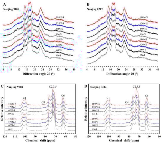 The irregularly arranged or short-range helical structures could not be detected by XRD, but detected by 13C solid-state NMR [49]. Therefore, in order to further clarify the differences in starch crystal structure, the helical structure of starch was analyzed by 13C solid-state NMR technique. The native starch spectra was separated into an ordered sub-spectra at the 84 ppm position (Figure 3C,D) as described by Tan et al. [33]. Nuclear magnetic resonance imaging showed that there were four signal regions in starch of japonica rice, namely C1, C4, C2, 3, 5 and C6. The triple peaks in C1 region (94–105 ppm) indicated that the crystal structure was type A. The C1 region had no overlapping signals for other carbon sites, so the region was selected to calculate starch amorphous region, single helix and double helix content. Nitrogen, variety, position, and V × P had significant effect on amorphous, single helix, and double helix (Table S2). The amorphous region of superior grains was higher than that of inferior grains, while the content of single helix and double helix was lower than that of inferior grains (Table 5). The amorphous region of superior grains under high nitrogen (120 N and 180 N) treatments was 2.29–7.07% higher than that of inferior grains, while the single helix and double helix contents were 2.34–6.53% and 12.15–22.99% lower, respectively, all of which were significantly different.