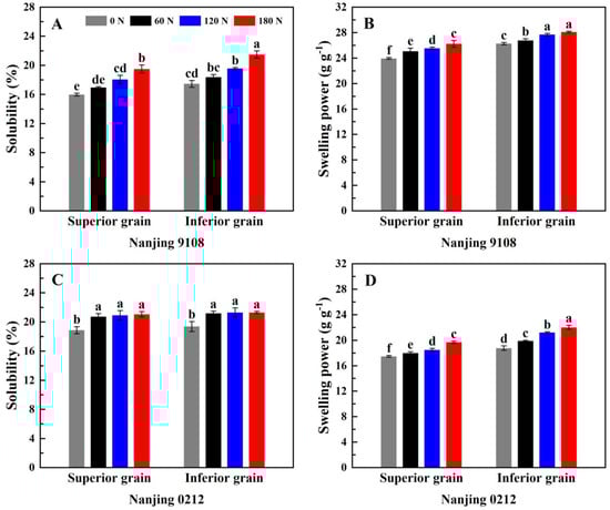 According to Table S3, nitrogen, variety, and position had significant effect on starch solubility and swelling power. Figure 2 shows the changes in starch solubility and swelling power of japonica superior and inferior rice grains under different PNF treatments. The solubility of Nanjing 9108 superior grains was significantly lower than that of Nanjing 9108 inferior grains, and was comparable to that of inferior grains in Nanjing 0212 (Figure 4A,C). The swelling power of superior grains was 6.24–12.81% significantly lower than that of inferior grains in all PNF treatments (Figure 4B,D). Amylose limited the swelling of starch granules and maintained the integrity of swollen starch, and higher amylose content was the reason for the lower swelling power of superior grains. Starch granules with a high volume mean diameter had a large surface area, which tended to bind water easily, and had good hydrophilicity [52]. There was a certain number of differences in the starch granule size distribution between two varieties chosen in this study. The volume mean diameter of Nanjing 9108 superior grains was significantly lower than that of Nanjing 9108 inferior grains, while that of Nanjing 0212 superior grains was slightly higher than that of Nanjing 0212 inferior grains. This may explain the difference in solubility of superior and inferior grains.