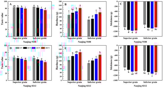 Taste value (A,D), hardness (B,E) and stickiness (C,F) of superior and inferior grains of japonica rice under different PNF treatments. Values with different letters are significantly different (p < 0.05).