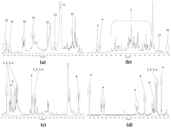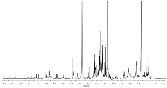 NMR experiments were performed using a Bruker DRX-600 Avance spectrometer operating at 600.13 MHz for 1H, equipped with an xyz gradient unit. Spectra were processed using Bruker TopSpin software (version 3.6.1, Bruker, Bremen, Germany). The dried extract was freeze dried to remove the eventual humidity, and then reconstituted in deuterated methanol (MeOD-d4) for NMR analysis.