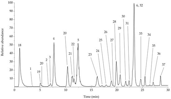 The dried extracts were resuspended in MeOH/H2O (60:40, v/v) filtered through a 0.2 μm PTFE syringe filter (Whatman) before injection, and analyzed through data dependent analysis, resulting in the chromatogram reported in Figure 3.