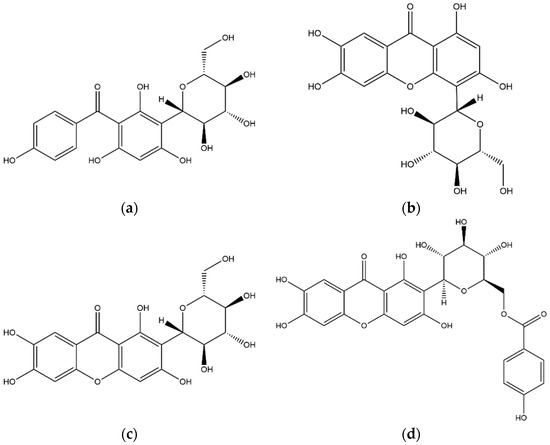 Structures of selected xanthones identified in the coffee leaf extract: (a) iriflophenone 3-C-glucoside, (b) isomangiferin, (c) mangiferin, (d) 6-O-(p-hydroxybenzoyl)mangiferin.