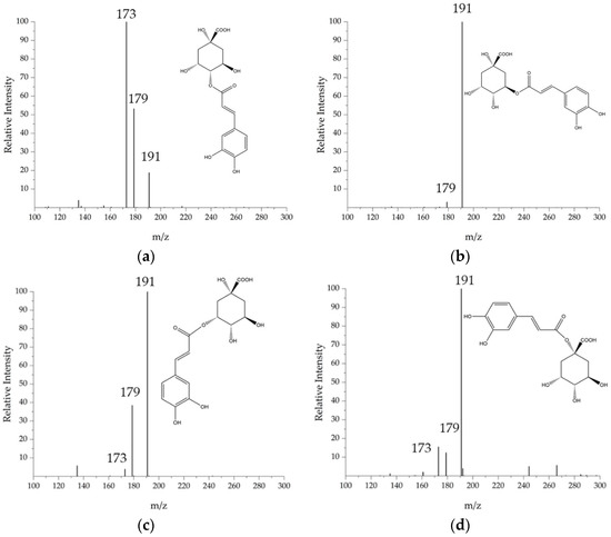 Tandem mass spectra of the compounds 1, 2, 3, and 4, identified as chlorogenic acids: (a) 4-CGA, (b) 5-CGA, (c) 3-CGA, (d) 1-CGA.