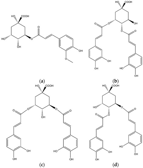 Structures of the chlorogenic acids identified in the coffee leaf extract: (a) 5-feruloyl-quinic acid, (b) 3,4-dicaffeoyl-quinic acid, (c) 3,5-dicaffeoyl-quinic acid, (d) 4,5-dicaffeoyl-quinic acid.