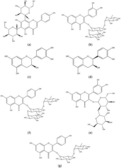 Structures of the main flavonoids identified in the coffee leaf extract: (a) apigenin 6,8-di-C-glucoside, (b) rutin glicoside, (c) (+)catechin, (d) (+)epicatechin, (e) quercetin sophoroside, (f) kaempferol triglycoside, (g) kaempferol rhamnoglucoside.
