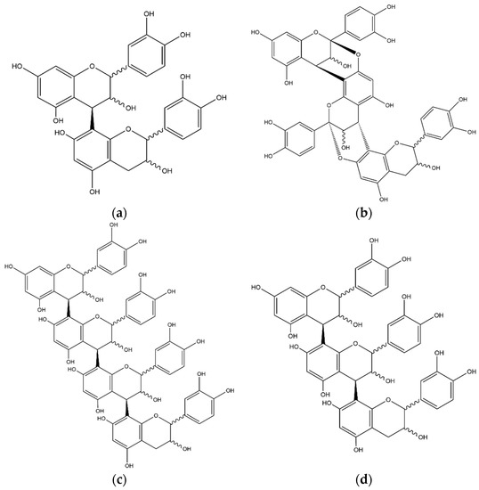 Structure of the identified procyanidins: (a) procyanidin B, (b) procyanidin dimer A-type, (c) procyanidin tetramer B-type, (d) procyanidin C.