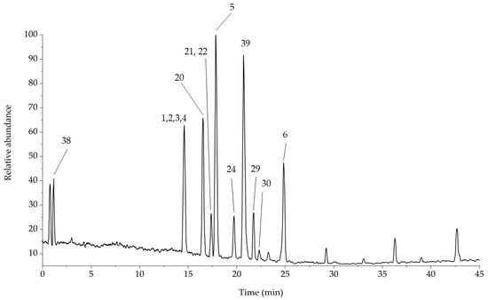 The acquisition of the positive ionization chromatogram was necessary to study different classes of compounds contained in the extract, together with the same species already characterized in the previous paragraph. The obtained chromatogram is reported in Figure 10.