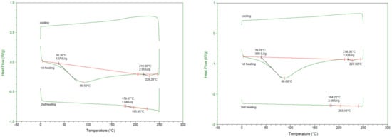 DSC and TGA were carried out on powder with a particle size of 32 mesh. DSC (differential scanning calorimetry) was used to measure the behavior of particles on a DSC-Q20 (TA Instruments, New Castle, DE, USA). The sample weight was 3–3.8 mg and analysis was carried out at a heating rate of 10 °C/min in the range of 0 to 250 °C. The experiment was conducted as follows: 1st heating → 1st cooling → 2nd heating → 2nd cooling. The indium (99.99%) was used for the temperature and enthalpy calibration in the experiment. Tg was measured as the midpoint of the transition during the scan, which was obtained by repeating the experiment twice. TGA (thermos-gravimetric analysis) was performed using TA-Q500 (TA Instruments, New Castle, DE, USA). Approximately 7–10 mg were weighed into a platinum pan and heated over the temperature range of 0 to 800 °C at a heating rate of 10 °C/min under a nitrogen purge [25].