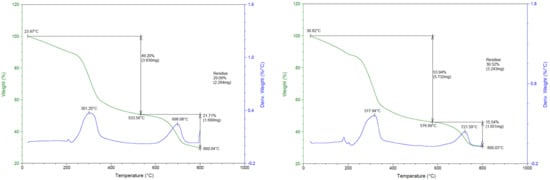 TGA is not only a good indicator of the thermal stability of polymer materials, it is also a good method for measuring the decomposition temperature of biodegradable polymer materials [39]. Accordingly, Figure 3 shows the weight loss (%) curve and derivative weight (%/°C) plotted against the degradation temperature, with different amounts of walnut powder. In the TGA curves of both materials, three different weight losses are observed. The weight loss at 1–200 °C is considered to be due to the decomposition of the eggshell powder and the low molecular weight sodium alginate sprayed as a coating [40,41]. Thereafter, the weight of the PEW1 biodegradation container was reduced to 49.20% at 533.56 °C, and that of PEW2 was reduced to 53.94% at 576.99 °C, showing significant weight loss. This is similar to the decomposition temperature of lignin present in lignocellulosic biomass [42]. The two samples show the same result because they are similar materials, but PEW2 contains a higher amount of walnut powder per gram. In the third loss section, the two samples show similar final temperature values of 800.04 °C (PEW1) and 800.03 °C (PEW2). PEW1 shows initial decomposition at 225 °C and peak thermal decomposition at 301.20 °C. A second decomposition occurs at 620 °C, and the third decomposition at 696.08 °C. PEW2 shows double decomposition at 210 and 670 °C, and peak thermal decomposition at 317.94 and 721.59 °C. Overall, PEW1 and PEW2 show similar behavior and derivative weight, but it can be seen that PEW2 has slightly higher decomposition temperatures. This is thought to be because PEW2 contains more substances such as lignin, thus raising the decomposition temperature [43].