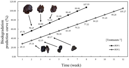 Biodegradation prediction curve (%) for biodegradable containers made from pork skin gelatin, walnut shells, and eggshells. 1 PEW1: pork gelatin, eggshell and 0.08 wt% walnut shell; PEW2: pork gelatin, eggshell and 0.14 wt% walnut shell.