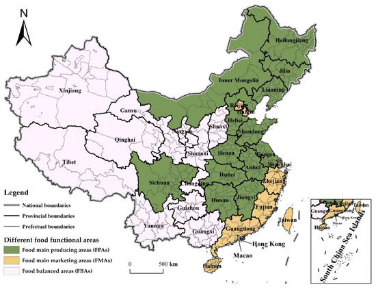 In addition, to examine the regional differences of the CDUFS, the provinces where the prefecture-level cities are located nationwide are divided into three different food functional areas (Figure 1), food main producing areas (FPAs), food main marketing areas (FMAs) and food balanced areas (FBAs), according to different agricultural production endowments and subjects [22].
