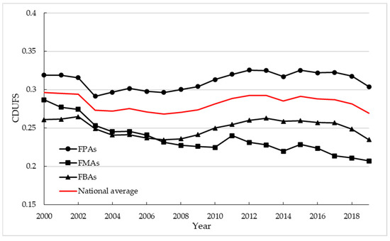 After measuring the CDUFS at the prefecture-level city, the national average CDUFS changed overall from 0.2965 to 0.2691, showing a significant downward trend and always fluctuating within the low coordination interval. The CDUFS showed an obvious regional differentiation in different food producing areas (Figure 2), mainly in the following ways: FPAs > FMAs > FBAs. Specifically, FPAs belonged to moderate coordination, while the FMAs and FBAs belonged to low coordination, and both showed a fluctuating downward trend, with the FMAs showing a more prominent downward trend.