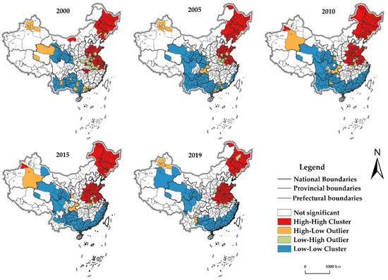 - High-High Cluster (H-H). Areas with H-H are mainly distributed in the FPAs such as the Northeast Plain, the North China Plain, and the middle and lower reaches of the Yangtze River. The coverage of H-H in general also showed a steady expansion of changes. The H-H areas in 2000 were mainly located in the FPAs of Northeast Plain, North China Plain and the lower Yangtze River. By 2019, the distribution expanded significantly to the FPAs in the center region, especially Hubei and Henan. Overall, the distribution of H-H was more stable, and its distribution range was gradually expanding to the FPAs in the middle reaches of the Yangtze River.