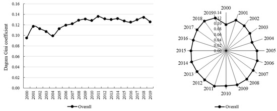 The Dagum–Gini coefficient of CDUFS ranged from 0.0953 to 0.1360, with a mean value of 0.1223 during study period, implying that the coordination relationship between urbanization and food security exhibited a certain spatial disequilibrium. After a brief oscillation until 2004, the Gini coefficient of the the CDUFS showed an upward trend and reached a maximum in 2011 (0.1360), after which it declined slightly in fluctuations (Figure 4). The Gini coefficient of the CDUFS increased by 0.0305, or 32.00%, with a more significant increase, so the overall regional differences of the CDUFS in China have expanded.