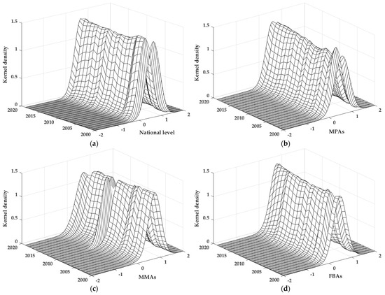 Kernel density estimation of the national level and different food functional areas. Note: This figure is drawn by the authors themselves using MATLAB based on the calculation results. (a) National level; (b) FPAs; (c) FMAs; (d) FBAs.