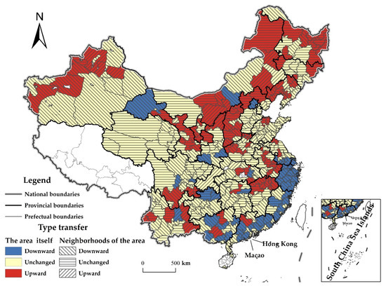 Figure 6. Spatial distribution of CDUFS type of transfer under the spatial Markov chain. Note: This figure is drawn by the authors themselves using ArcGIS based on the calculation results. - (2)