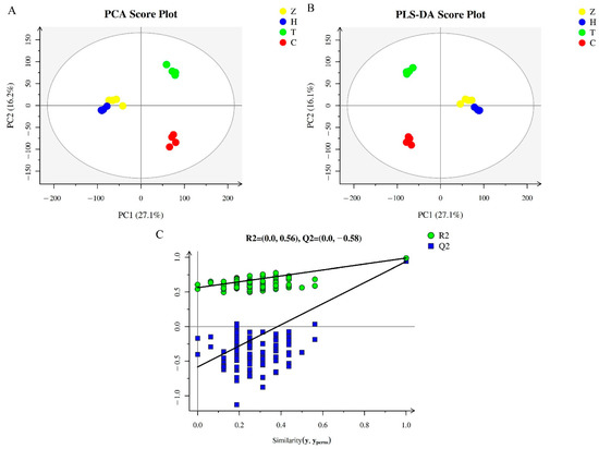 QC analysis results of metabolomics of different C. album cultivars. (A) PCA score plot for the 21,438 metabolites found in this study. (B) PLS-DA score and permutation test plots of the total 21,438 metabolites. (C) Displacement inspection result diagram. The yellow, blue, green, and red dots represent C. album cv. ‘Zilaiyuan’ (Z), ‘Huiyuan’ (H), ‘Tanxiang’ (T), and ‘Changying’ (C), respectively. The abscissa and ordinate represent the first and the second principal components, respectively.