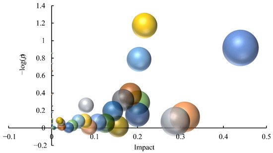Influence of differential metabolites on the metabolic pathways of distinct C. album cultivars. Each dot represents a metabolic pathway. Ordinate values indicate the significance of metabolites enriched in this pathway, with higher values reflecting greater significance levels. The abscissa indicates the influence level of DAMs on the metabolic pathway; the values and dots of highly influenced metabolic pathways are larger.