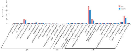 GO classification of upregulated and downregulated DEGs identified between ‘Changying’ and ‘Huiyuan’ fruits. BP: biological process; CC: cellular component; MF: molecular function.