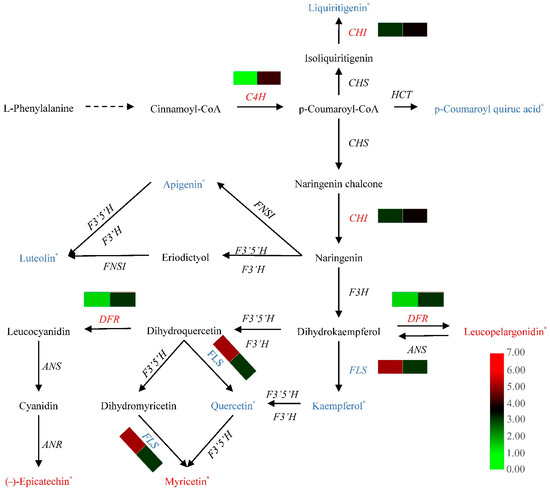 Correlation analysis of flavonoid biosynthesis-related DEGs and DAMs. Different colors in the heatmap indicate different gene expression levels; * indicates that there is a significant difference in the content of the metabolite between the two cultivars. Red indicates that the gene expression level or metabolite content in ‘Huiyuan’ is greater than that in ‘Changying’, and blue indicates that the gene expression level or metabolite content in ‘Huiyuan’ is less than that in ‘Changying’. C4H: cinnamic acid 4-hydroxylase; CHS: chalcone synthase; CHI: chalcone isomerase; HCT: hydroxycinnamoyl-CoA: shikimate hydroxycinnamoyl transferase; FNSI: type I flavone synthase; F3′5′H: flavonoid-3′-5′-hydroxylase; F3′H: flavonoid-3′-hydroxylase; F3H: flavonone-3-hydroxylase; FLS: flavonol synthase; DFR: dihydroflavonol reductase; ANS: anthocyanidin synthase; ANR: anthocyanidin reductase.