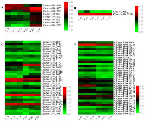 Heat map analysis of FPKM values of related genes involved in flavonoid biosynthesis. (A) The map shows the change in FPKM values of selected DEGs in flavonoid biosynthesis in different C. album cultivars. (B) Heat map showing the changes in FPKM values of selected WD40 transcription factors in different cultivars of C. album. (C) Heat map showing the changes in FPKM values of selected MYB transcription factors in different cultivars of C. album. (D) Heat map showing the changes in FPKM values of selected bHLH transcription factors in different cultivars of C. album. Each column represents a given sample and each row indicates relative expression or FPKM value of the gene written on the right-hand side.
