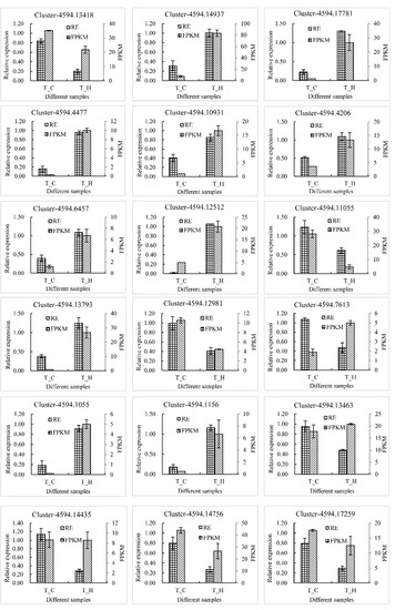 qRT-PCR verification of candidate genes related to flavonoid synthesis. RE and FPKM respectively represent the relative expression and fragments per kilobase million of each gene in different samples. Cluster-4594.13418, Cluster-4594.14937, Cluster-4594.17781, Cluster-4594.4477, Cluster-4594.10931, Cluster-4594.4206, Cluster-4594.6457, and Cluster-4594.12512 represent FLS, CCoAOMT, C3′H, DFR, LAR, CHI, LAR, and C4H genes, respectively. Cluster-4594.11055, Cluster-4594.13793, Cluster-4594.12981, Cluster-4594.7613, Cluster-4594.1055, and Cluster-4594.1156 belong to the MYB transcription factor gene family, and Cluster-4594.13463, Cluster-4594.14435, Cluster-4594.14756, and Cluster-4594.17259 are different members of the bHLH transcription factor gene family.