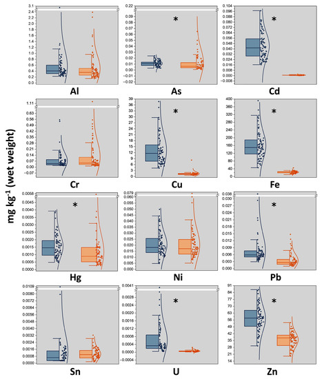 For descriptive statistics, elemental concentrations referring to freeze-dried samples were transformed to fresh sample concentrations according to the average moisture contents of muscles or livers and expressed as mg kg−1 or µg kg−1 wet weight (see Section 2.2).