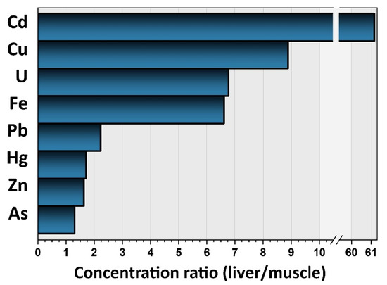 Occurrence data of TMMs in the pig muscles and pig livers analyzed in the present work are summarized in Figure 1 and detailed in Table S4 of the Supplementary Materials. The elements were found in the following order of abundance (median concentrations, mg kg−1, wet weight): Zn (38) > Fe (23) > Cu (1.3) > Al (0.36) > Cr (0.047) > Ni (0.017) > iAs (0.0063) > iHg (0.0033) > Pb (0.0026) > Sn (0.00099) > Cd (0.00068) > U (0.000048) in muscles; Fe (150) > Zn (58) > Cu (12) > Al (0.41) > Cr (0.042) > Cd (0.042) > Ni (0.018) > iAs (0.011) > Pb (0.0059) > iHg (0.0049) > Sn (0.00064) > U (0.00033) in livers. Except for Al, Cr, Ni, and Sn, all the measured TMM levels were significantly higher (p < 0.01) and more widely distributed in liver compared to muscle samples (Figure 1). This scattered distribution implies the existence of a high inter-animal variability among pigs which, besides deriving from feed, environment, and farming practices, may be linked to individual genetic factors [40,41]. As expected, Cu, Fe, and Zn were the prominent elements in both tissues, where they exert biologically important functions and are regulated by homeostatic processes [42]. In general, concentrations of these elements, together with those of Al, Cr, and Ni, were in line with those found in other countries such as China [11,43,44], Serbia [16,45], and Poland [46]. Comparison with literature data is, however, a complex task due to the contribution of many factors, among which is the type of muscle. For instance, Cu was reported to be less abundant in pectoral muscle than in diaphragm of cattle [47]. Wild boars and domestic pigs were reported to deposit two or three times the Cu in the liver compared to muscles [17,48], but, in the present investigation, a 9-fold higher concentration in the hepatic than in the muscle tissue was recorded (Figure 2). This, together with the fact that 3 out 80 (4%) liver samples exceed the maximum residue limits of Cu (as pesticide residue) of 30 mg kg−1 [39], may suggest a potential targeted accumulation in this organ, which, in turn, can be the consequence of its administration in intensive farming systems as mineral supplements.