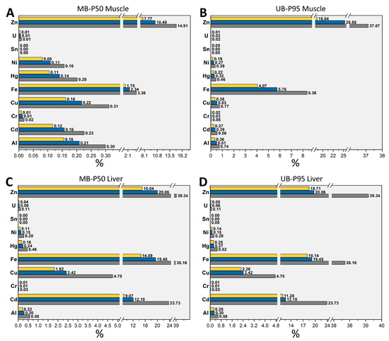 Contribution percentages of pig meat (A,B) and pig liver (C,D) consumption to the HBGVs of Al, Cd, Cr, Cu, Fe, iHg, Ni, Sn, U, and Zn according to the estimated less pessimistic (MB-P50, A,C) and worst-case (UB-P95, B,D) dietary exposure scenarios for Italian population age groups (yellow bars: adults; blue bars: adolescents; gray bars: children).