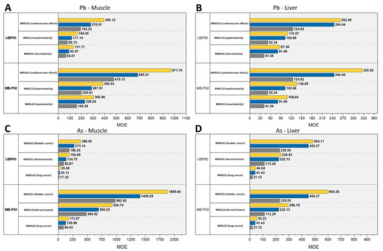 Overall, significantly lower MOEs of both Pb and iAs were observed for children compared to adults and from liver compared to muscle, except for the UB-P95 exposure to iAs (Figure 4C vs. Figure 4D). In this case, the lower MOEs were mainly due to the higher dietary exposure values deriving from muscle consumption compared to liver (Table 1) which, in turn, were influenced by the significant number of missing values and their replacement with MLOD values (see Section 2.4 and Section 2.5.2). On the contrary, the lowest and the least safe MOEs to Pb and iAs of children (calculated at the UB-P95 exposure levels) were related, respectively, to the 1% increased risk of neurotoxicity from pig liver consumption (MOE = 42, Figure 4B) and the 1% increased risk of lung cancer from pig meat consumption (MOE = 17, Figure 4C). Even though these dietary exposures of children to iAs resulted in MOEs > 1, the whole diet and drinking water, when taken together as routes of exposure, could be supposed to further reduce MOEs to significantly lower levels [65]. In addition, albeit the period of exposure would be potentially limited to childhood lifespan, an increased risk of cancer in adulthood could still be associated with the exposure to the same iAs during early stages of life [66]. The same considerations could be made for Pb: although dietary exposure of children to Pb resulted in MOEs > 1 and the risk of neurological development impairment could be considered low, the overall risk of adverse health effects could not be excluded due to the high vulnerability of children to toxic substances [60].