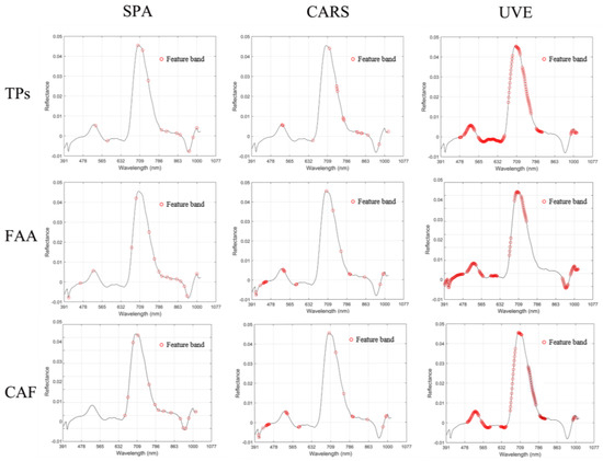 - Three methods for selecting characteristic bands, SPA, CARS, and UVE, are compared comprehensively. Among them, CARS (TPs-CARS-PLS, RP2 = 0.91) and SPA (TPs-SPA-PLS, RP2 = 0.90) achieved higher results, which not only ensures the accuracy of the model but also greatly reduces the complexity of the model.