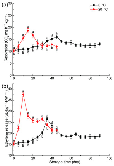 As a typical respiratory climacteric fruit, the respiratory rate of apple fruit significantly affects its physiological state [32]. As illustrated in Figure 2a, the respiratory rate of water-cored ‘Fuji’ apple increased rapidly after storage, reaching the peak of 18.78 CO2 mg·kg−1·h−1 after 15 days of storage, and then dropped speedily. Cold storage at 0 °C significantly reduced the respiration rate of fruits, and this gradually rose after storage. Potentially, the peak respiratory rate was delayed to 45 days after storage, delayed for 30 d, and the peak value was 16.18 CO2 mg·kg−1·h−1, which decreased by 13.8% compared with fruit storage at 20 °C. The results indicated that low temperature storage significantly delayed the respiration peak time of apple and reduced the peak value. This is basically consistent with the law of the respiratory rate of fresh-cut apples at different temperatures researched by Fagundes et al. [33]. It can be seen that low temperature can not only reduce the respiratory rate of fruit, but also the respiratory rate of fresh-cut slices. This is mainly because low temperature inactivate the enzymes related to physiological and energy metabolism such as respiration of apples, which significantly reduced the efficiency of respiration metabolism [34].