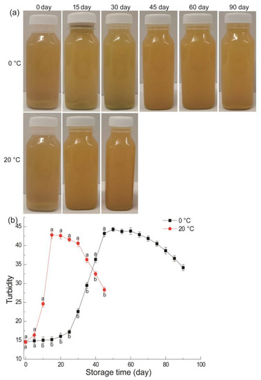 Turbidity directly reflects the stability of the juice system, and the larger its value, the more stable the juice system [43]. As demonstrated in Figure 3, the turbidity of apple juice varies significantly during different storage periods. For juice from fruit stored at 20 °C, fruits before storage showed the lowest turbidity (14.15) (Figure 3b) and the most sediment at the bottom of bottle (Figure 3a), whereas fruits stored for 15 days indicated the highest turbidity (45.22) and the least sediment at the bottom of bottle. After 30th day of storage, the turbidity of freshly squeezed juice dropped and the sediment rapidly increased at the bottom of the bottle. For juice from fruit stored at 0 °C, fruits stored for 45 days indicated the highest turbidity (46.88) and the least sediment at the bottom of bottle. The turbidity of freshly squeezed juice decreased and the sediment rapidly increased at the bottom of bottle during the last 30 days of storage.