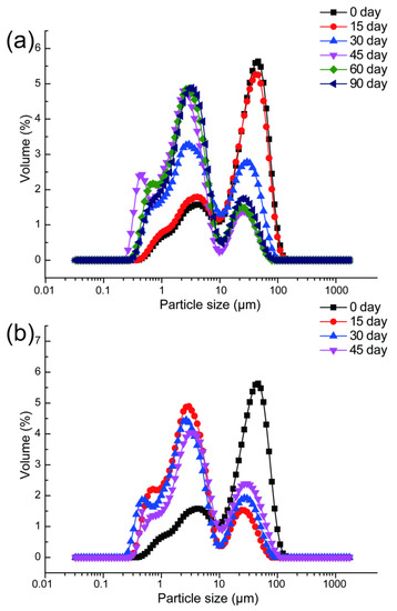 The PSD was measured by BT-9300ST Mastersizer (Better Instrument Co. Ltd., Dandong, China). The range it can measure extends from 0.1 to 2600 μm particles. The volume-mean diameter D (4,3), area-mean diameter D (3,2) and median particle diameter (D50) of all samples were calculated utilizing software (Microtrac-Bluewave, Montgomeryville, PA, USA) provided by the device. It was first necessary to clean the system with deionized water, then put the sample into a small-volume dispersion unit device and uniformly disperse it with a stirrer [27]. The measurement commenced when the ambiguity of the sample reached about 5%. All measurements were done in triplicate.