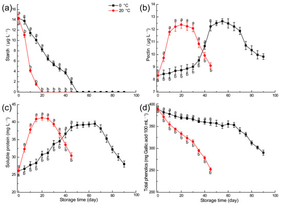 The concentration of starch (a), pectin (b), soluble protein (c), and total phenolics (d) in NFC apple juice from fruit under different temperatures and times. Vertical bars indicate ± standard errors of the mean values (n = 3). Different letters represent significant differences among different treatment for each sampling time at p < 0.05.