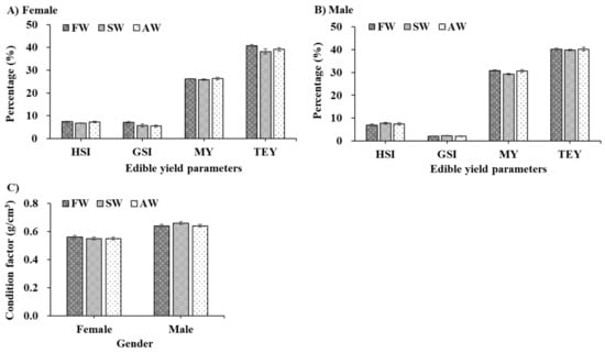 The edible yield (% body weight, (A,B)) and condition factor (%, (C)) of adult Eriocheir sinensis from different culture environments. The data are presented as mean ± standard error (SE) (n = 20). FW, freshwater; SW, saline water; AW, Alkaline water; HSI, hepatosomatic index; GSI, gonadosomatic index; MY, meat yield; TEY, total edible yield.