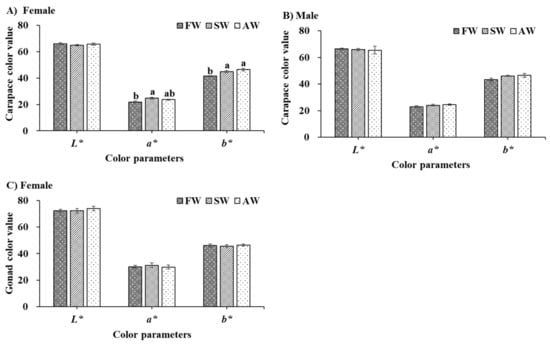 Significantly higher a* (redness) and b* (yellowness) values of freeze-dried female carapace were observed fattening in SW and AW compared with that of FW (p < 0.05) (Figure 2A). No significant differences existed between the freeze-dried female gonad and male carapace among the three treatments (Figure 2B,C) (p > 0.05), but the a* and b* values of freeze-dried male carapace still showed an increasing trend of fattening in SW and AW. Overall, the effects of fattening in SW and AW on the color quality of the carapace are more obvious than that of the female gonad.
