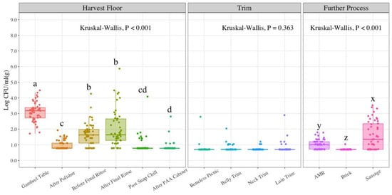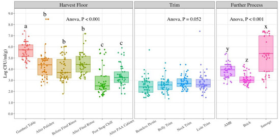 Aerobic counts in LogCFU/mL (g) at each processing stage throughout the pork processing line (n = 50; N = 650). The limit of detection (LOD) at harvest is 6 CFU/mL (0.78 LogCFU/mL); for trim and further process samples 5 CFU/g (0.70 LogCFU/g). In the boxplot, the horizontal line crossing the box represents the median, the top and bottom lines represent the lower (0.25) and upper (0.75) quartiles, the vertical top lines represent 1.5 times the interquartile range and the vertical bottom line represents 1.5 times the lower interquartile range. The dots represent actual data points. Box plots with different letters (a–c); (x–z) represent statistical significant differences acccording to ANOVA analysis followed by a pairwise T-test comparison using a p-value < 0.05. PAA (Peroxyacetic acid); AMR (Advanced Meat Recovery).