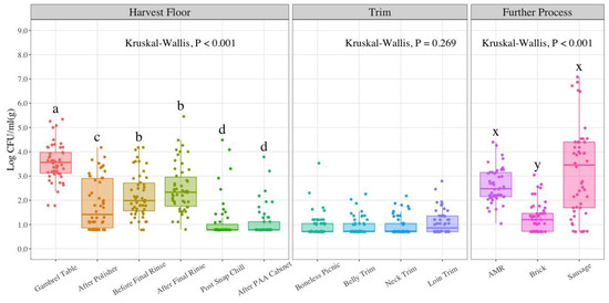 Enterobacteriaceae (EB) counts in LogCFU/mL (g) at each processing stage throughout the pork processing line (n = 50; N = 650). The LOD at harvest is 6 CFU/mL (0.78 LogCFU/mL); for trim and further process samples 5 CFU/g (0.70 LogCFU/g). In the boxplot, the horizontal line crossing the box represents the median, the top and bottom lines represent the lower (0.25) and upper (0.75) quartiles, the vertical top lines represent 1.5 times the interquartile range and the vertical bottom line represents 1.5 times the lower interquartile range. The dots represent actual data points. Box plots with different letters (a–d); (x, y) represent statistical significant differences according to Kruskal–Wallis analysis followed by pairwise comparison with Wilcoxon’s test at p-value < 0.05. PAA (Peroxyacetic acid); AMR (Advanced Meat Recovery).