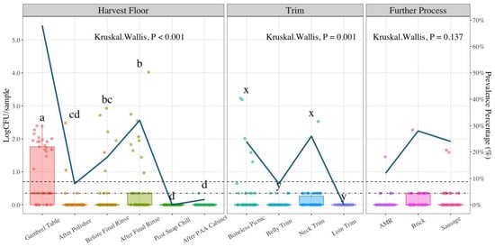 Generic E. coli (EC) counts in LogCFU/mL (g) at each processing stage throughout the pork processing line (n = 50; N = 650). The LOD at harvest is 6 CFU/mL (0.78 LogCFU/mL); for trim and further process samples 5 CFU/g (0.70 LogCFU/g). In the boxplot, the horizontal line crossing the box represents the median, the top and bottom lines represent the lower (0.25) and upper (0.75) quartiles, the vertical top lines represent 1.5 times the interquartile range and the vertical bottom line represents 1.5 times the lower interquartile range. The dots represent actual data points. Box plots with different letters (a–d); (x–z) represent statistical significant differences according to Kruskal–Wallis analysis followed by pairwise comparison with Wilcoxon’s test at p-value < 0.05. PAA (Peroxyacetic acid); AMR (Advanced Meat Recovery).