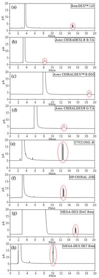 Chromatograms of 2-pentanol racemate separated by different chiral chromatographic columns (a): Beta DEX™ 120, (b): Astec CHIRADEXL® B-TA, (c): Astec CHIRALDEX™ B-DM, (d): Astec CHIRALDEX® G-TA, (e): CYCLOSIL-B, (f): HP-CHIRAL-20B, (g): MEGA-DEX DAC Beta, (h): MEGA-DEX DET Beta.