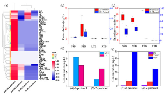 (a): 2-pentanol enantiomers concentration heat map, (b): Double y-axis box line plot (Red coordinates were (R)-2-pentanol, blue coordinates were (S)-2-pentanol) of 2-pentanol isomer concentration using LLE, (c): Double y-axis box line plot of 2-pentanol enantiomeric ratio using LLE, (d) Box Line plot of 2-pentanol enantiomer content in MT43 and LJ, (e) Box Line plot of 2-pentanol enantiomer content in DK, YHMZL, and WLY.
