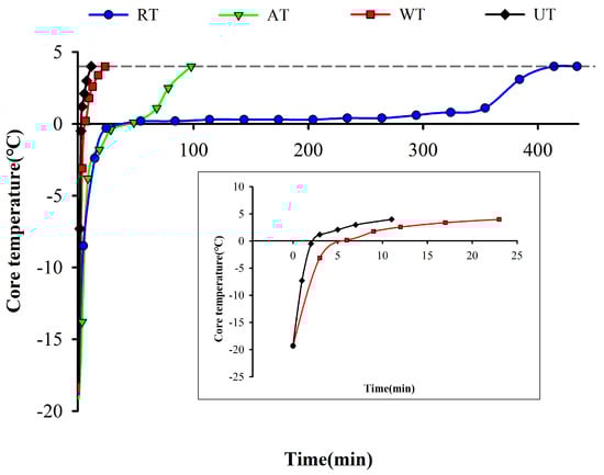 The time-temperature curves of instant sea cucumbers subjected to four thawing methods. In the gray box, we present the thawing curves for WT and UT from 0 to 25 min. RT, refrigerator thawing; AT, air thawing; WT, water immersion thawing; UT, ultrasonic-assisted thawing. The abbreviations of thawing methods are the same below.