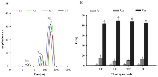 Figure 2B represents the area proportions of various water peaks for instant sea cucumber processed using four thawing methods. Comparing the area proportions of various water types, bound water (P21) occupied the smallest area at 2%, immobile water (P22) occupied about 12%, and free water (P23) reached almost 86%. Liu et al. [] also found that the calculated peak areas of bound water, immobile water, and free water were 91.83 ± 2.80, 179.42 ± 1.71, and 2493.20 ± 2.14 g−1 for instant sea cucumbers, which indicates that free water content greatly outnumbered bound water and immobile water. After cooking, proteins of the instant sea cucumber body wall were depolymerized with enlarged gaps between fibers, leading to an increase in free water mobility []. In addition, the difference in bound water among different thawing methods was not significant (p > 0.05). This result may be because bound water was tightly bound to the proteins of the sea cucumber body wall, independent of any mechanical stress or microstructural changes, and could withstand the temperature increase during the thawing process []. The ranking trend of P22 was opposite to that of P23, due to the fact that the water population in the sample processed using different thawing methods was able to generate mutual transformation []. P22 was significantly higher in RT and UT samples than in AT and WT samples (p < 0.05), suggesting that RT and UT samples could retain more intracellular water.
