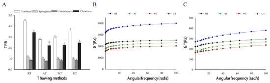 Influence of different thawing methods on TPA (A) and rheological properties (B,C) of frozen instant sea cucumber. (B,C) represent changes in the storage modulus and loss modulus. The units of hardness and chewiness are kilograms (kg). Values of different groups with different lowercase letters (a–d) are significantly different at p < 0.05.