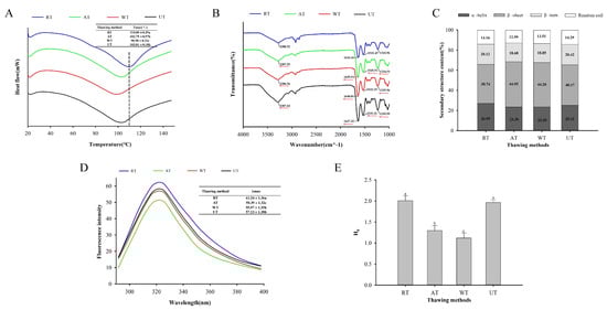 Influence of different thawing methods on the differential scanning calorimetry (DSC) (A), fourier transform infrared radiation (FTIR) (B), protein secondary structure (C), fluorescence spectroscopy (D), and surface hydrophobicity (E) characteristics of frozen instant sea cucumber. Values of different groups with different lowercase letters (a–c) are significantly different at p < 0.05.
