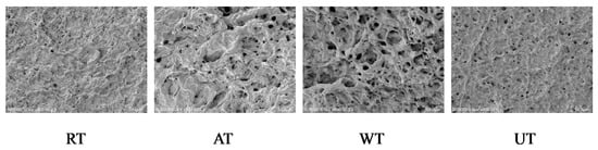 The impact of diverse thawing methods on the microstructures of instant sea cucumbers is shown in Figure 5. Changes in moisture migration and protein oxidation during the thawing process led to destruction of the protein structure, which directly affected the microstructure []. As described in Figure 5, RT samples presented many uneven fragments, gaps, and pores of small size. In contrast with RT samples, increased numbers of pores with smaller and more uniform shapes were observed in UT samples. In AT and WT samples, we could observe more crimping, fractures and denaturation, increased numbers of pores with an uneven distribution, and fractured fibers encapsulating the pores, which loosened the sample texture. The results indicated that RT caused minimal disruption to the microstructure, followed by UT, WT, and AT. This outcome is similar to the findings of Xia et al. [], who found that RT samples presented the least damage to the microstructure of the porcine longissimus muscle.