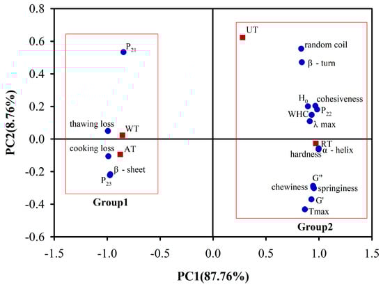 In the above analyses, we observed similar trends in terms of the water retention, mechanical properties, and protein properties of sea cucumber samples processed using four thawing methods. Therefore, we used PCA to analyze the linear combination of the moisture, mechanical, and protein properties of instant sea cucumber post-thawing. As shown in Figure 6, the PCA results revealed that the first two principal components (PCs) were responsible for 96.52% of the total variance of the data (87.76% PC1 and 8.76% PC2), which indicated there was a strong correlation between the selection of thawing methods and the quality of frozen instant sea cucumber. The physicochemical properties and thawing methods were located in quadrants 1, 2, 3, and 4. On the other hand, the treatments located in quadrants 1, 2, 3, and 4 were related to the variables in the corresponding quadrants []. The four thawing methods can be divided into two groups based on the horizontal coordinate PC1, i.e., we observed a clear difference between these two groups of frozen instant sea cucumbers. The first group is characterized by AT and WT samples, as these were the samples with the highest thawing loss, cooking loss, P21, P23, and β-sheets. The second group includes RT and UT samples, with the highest WHC, P22, TPA, G′, G″, Tmax, α-helix, β-turn, random coil, λmax, and H0 values. Based on these results, we inferred that the frozen instant sea cucumber samples obtained after RT and UT were of better quality than those obtained after AT and WT. Furthermore, the α-helix was very closely linked to hardness, Tmax to the loss modulus G′, and H0 to cohesiveness. We hypothesized that the destruction of the protein structure was primarily responsible for the decrease in the mechanical properties of instant sea cucumbers after thawing.
