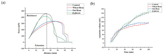 The resistance is a sign of the longitudinal elasticity of the dough, which indicates the toughness of the dough [18]. As seen in Figure 1a, the wheat and oat bran reduced the maximum resistance of the dough compared to the control group. The reason might be that the bran loosens the gluten structure of the mixed dough, which reduces the resistance [19,20,21]. The more significant reduction in the resistance of the dough made by wheat bran may be ascribed to the higher fiber content in the wheat bran, resulting in a looser gluten structure. Compared with the control group, β-glucan significantly decreased the resistance of the dough. Therefore, replacing wheat bran with oat bran or β-glucan is a promising approach to balance the nutritional value of low GI bread with the resistance index of the dough.